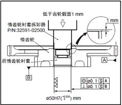 (2) 使用惰齒輪襯套拆卸工具的裝入端,從大齒輪端將惰齒輪襯套壓入至齒輪轂的端面平齊。再用惰齒輪襯套拆卸工具的拆卸端,將襯套端面壓入至低于齒輪轂端面約1mm。