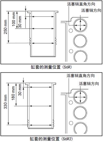 選擇三菱S6R柴油發(fā)動機(jī)缸套內(nèi)側(cè)的上部( 上死點(diǎn)時(shí)No.1 氣環(huán)的位置)、中間部分和O形圈插入部分,沿三菱S6R柴油發(fā)動機(jī)活塞銷方向及其直角方向,測量三菱S6R柴油發(fā)動機(jī)缸套的內(nèi)徑。
