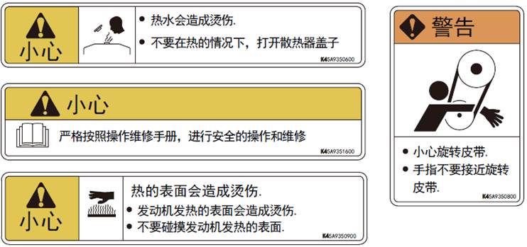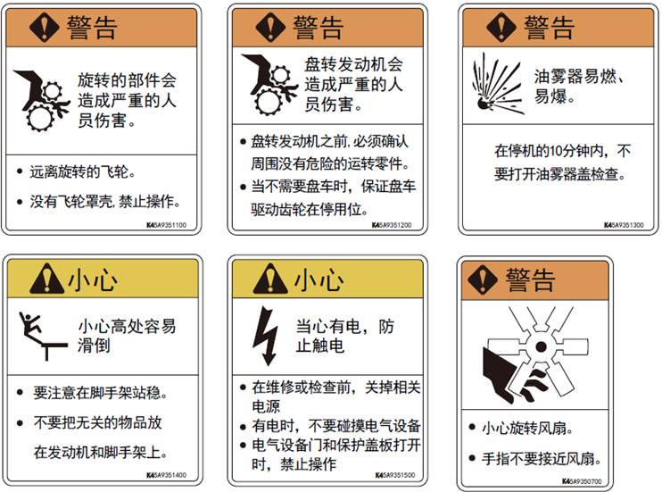 在更換貼有警告標簽的三菱R16柴油發(fā)動機零部件時,在新更換的零部件上也要貼上同樣的新的警告標簽。需要購買新的警告標簽時,請向我公司的指定經銷商聯(lián)系。