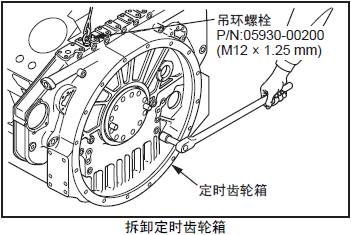 (1) 安裝吊具以防三菱S12柴油發(fā)動(dòng)機(jī)正時(shí)齒輪箱掉落。