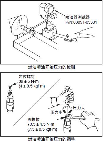 (2) 以大約每秒1次的速度向下壓手柄,檢測(cè)噴油的開始?jí)毫?。不在?biāo)準(zhǔn)值范圍以內(nèi)時(shí)進(jìn)行調(diào)整。