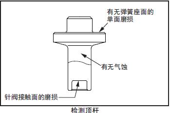 目測(cè)檢查頂桿,發(fā)現(xiàn)彈簧座單側(cè)磨損、針閥接觸面顯著磨損或下面錐部氣蝕時(shí)更換新的頂桿。