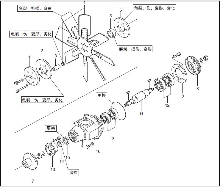 檢測三菱S12柴油發(fā)動(dòng)機(jī)風(fēng)扇驅(qū)動(dòng)軸和驅(qū)動(dòng)器殼體的軸承安裝部位,嚴(yán)重磨損時(shí)更換新品。