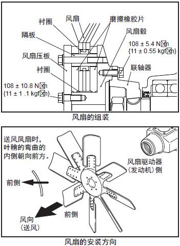 注: 安裝時(shí),注意三菱S12柴油發(fā)動(dòng)機(jī)風(fēng)扇的安裝方向( 風(fēng)向:排出) 不要裝錯(cuò)。