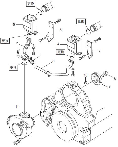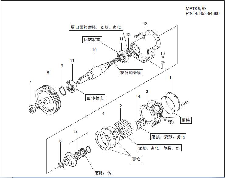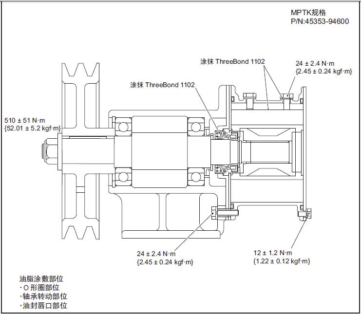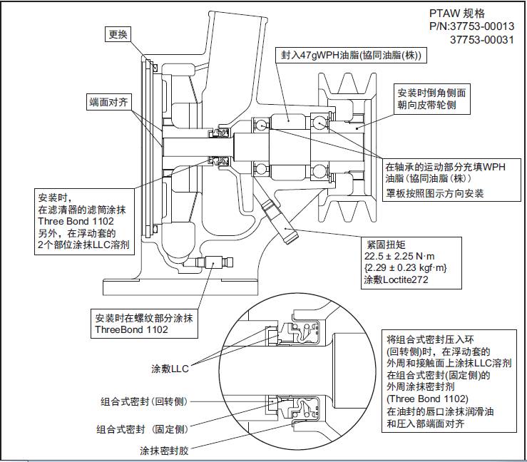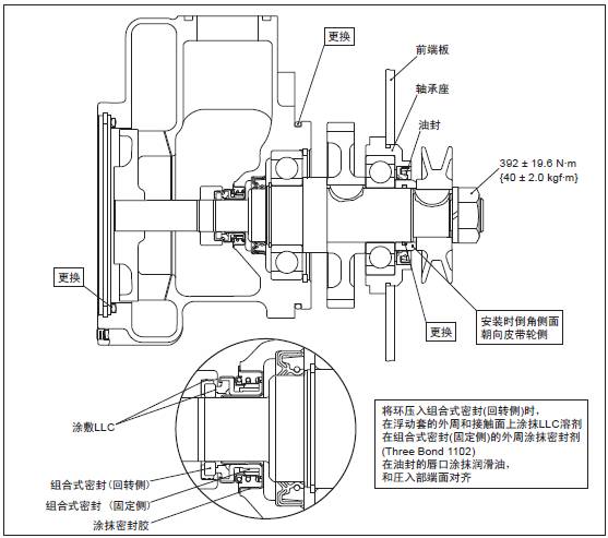 (1) 三菱S16柴油機皮帶輪側(cè)的球軸承回轉(zhuǎn)部分和三菱S16柴油機水泵泵體內(nèi)充填WPH油脂( 協(xié)同油脂㈱生產(chǎn))。