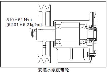 將三菱S16柴油機水泵皮帶輪安裝在三菱S16柴油機水泵軸上,按照規(guī)定的扭矩緊固螺帽。