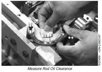 2. Remove rod cap. Compare width of PLASTIGAGEâ with scale provided on package to determine clearance. Replace bearings if oil clearance is out of specification.
