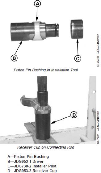 Use JD286 (JD-286) Piston Pin Bushing Remover and Installer for 41 mm (1.6 in.) pin, or JDE88 Piston Pin Bushing Remover and Installer for 35 mm (1.3 in.) pin to remove bushing.