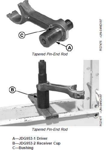 1. Select JDG953-1 Driver (A) and JDG953-2 ReceiverCup (B) from JDG953 Connecting Rod Bushing Service Set to remove bushing (C) from tapered rod.