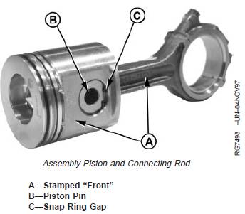 IMPORTANT: Pistons must be installed on connecting rods from which they were removed, and new piston pin snap rings must be used. Piston and connecting rod must be assembled so combustion bowl in piston is offset toward fuel injection pump side of engine when long side of connecting rod is toward the camshaft side of engine.