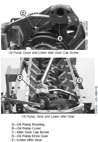 2. Put idler gear (D) and drive gear (E) in pump housing