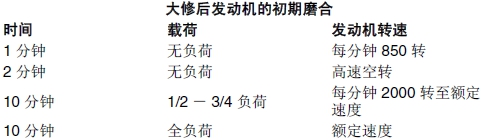 重要提示: 在磨合初期,定時(shí)檢查機(jī)油壓力和冷卻液溫度。還應(yīng)該檢查燃油、機(jī)油或冷卻液是否有泄漏跡象。一次全負(fù)荷運(yùn)轉(zhuǎn)時(shí)間不能超過(guò) 10 分鐘。