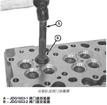 1. 用 JDG1653-1 閥門座孔拆裝器(A) 和 JDG1653-2 閥門座孔鑲圈安裝器(B) 安裝缸蓋閥門座孔鑲圈。用 JDG1653-2 閥門座安裝器的一端安裝進氣閥門座鑲圈,用另一端安裝排氣閥門座鑲圈。