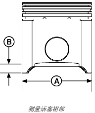 1. 在與活塞銷孔成 90°,距活塞底部 (B) 28 毫米(1.1英寸)處測量活塞裙部 (A)。記錄測量結(jié)果。