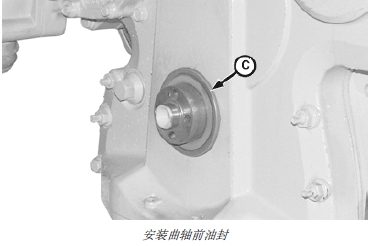 3. 在油封邊上涂上一層干凈的機(jī)油,將油封 (C) 裝在曲軸的凸緣上。(油封裝彈簧的一頭應(yīng)先裝進(jìn)正時齒輪蓋內(nèi)。)