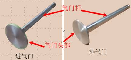 氣門(mén)分為進(jìn)氣門(mén)和排氣門(mén),分別控制進(jìn)氣和排氣,結(jié)構(gòu)相同,進(jìn)氣門(mén)頭比排氣門(mén)頭大。氣門(mén)由氣門(mén)頭和氣門(mén)桿兩部分構(gòu)成。氣門(mén)頭為圓盤(pán)形,氣門(mén)桿為圓柱形。氣門(mén)桿的尾部成錐形,用以安裝鎖片。氣門(mén)與氣門(mén)座共同形成密封面來(lái)密封氣缸內(nèi)氣體。