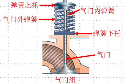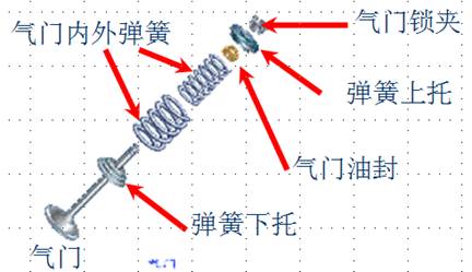 2、氣門(mén)組:氣門(mén)組包括氣門(mén)、氣門(mén)座、氣門(mén)導(dǎo)管、氣門(mén)彈簧、氣門(mén)鎖夾、氣門(mén)油封等零件。
