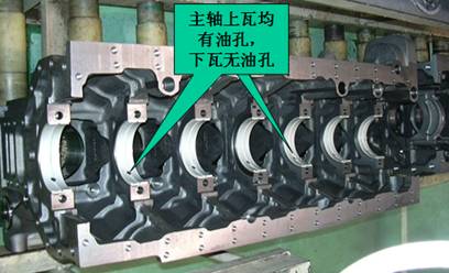 1主軸瓦上片有油槽和進油孔,與軸承座孔和主油道相通。下主軸瓦沒有油孔,安裝時應注意不要裝錯,以免堵塞油路。