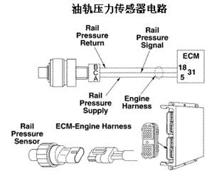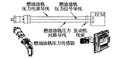 安裝在高壓燃油共軌內(nèi),其功能是:ECM利用該傳感器信號確定油軌中的燃油壓力,同時利用它來計算燃油供油量,工作范圍在0~1500 Ba,。傳感器出現(xiàn)故障將導致發(fā)動機動力下降、轉(zhuǎn)速降低甚至停車。