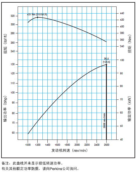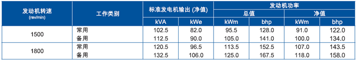 上表所有額定功率數(shù)據(jù)均為配備標準尺寸風扃與驅(qū)動器比率的發(fā)動機,ISO/TR 14396/IS0 8528條件下操作時數(shù)據(jù)。有關(guān)上述條件以外操作的數(shù)據(jù)請咨詢珀金斯公司,Perkins提供的性能公差為±5%。電氣參數(shù)假設(shè)功率因數(shù)為0.8與發(fā)動機效率90%。