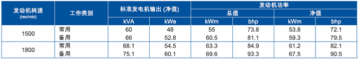 上表所有額定功率數(shù)據(jù)均為IS0 8528/1、IS0 3046/1:1986、BS5514/1條件下的發(fā)動機(jī)性能。在其他條件下工作時,性能可能降低。有關(guān)上述條件以外工作的數(shù)據(jù),請向Perkins公司咨詢。Perkins提供的發(fā)電機(jī)輸出功率為標(biāo)準(zhǔn)數(shù)據(jù),并根據(jù)平均標(biāo)準(zhǔn)交流發(fā)電機(jī)效率及0.8功率因數(shù)(cos.q)厘定。