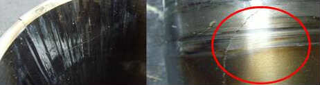 造成此故障的現(xiàn)象:發(fā)動機付水箱報警,油底殼中有防凍液,第一缸缸套與缸體結(jié)合部有防凍液漏出。 造成此故障的原因分析:缸套裂紋導致防凍液漏進油底殼形成油水混合,發(fā)動機缺水高溫形成拉缸故障 。 此故障的維修解決方法:更換活塞與缸套
