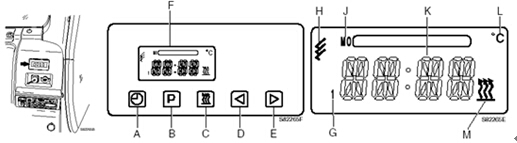 沃爾沃VOLVO B 系列挖掘機(jī)發(fā)動(dòng)機(jī)柴油加熱器 A時(shí)間設(shè)置開關(guān) B程序開關(guān) C加熱“開/關(guān)”開關(guān) D倒退開關(guān) E前進(jìn)開關(guān) F顯示窗口G記憶指示器 F遙控器符號(hào) J程序日 K當(dāng)前時(shí)間/計(jì)劃時(shí)間 L溫度顯示器 J加熱指示器