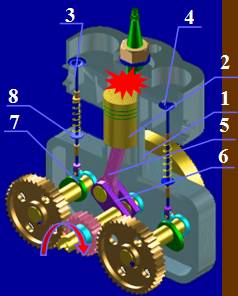 汽缸體1、活塞2、進(jìn)氣閥3、排氣閥4、連桿5、曲軸6、凸輪7、頂桿8、