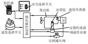 當(dāng)駕駛員將速度選擇開關(guān)置于某一檔位時,選擇開關(guān)將檔位信號傳送給微電腦控制器,微電腦控制器處理該信號后,通過驅(qū)動電路向調(diào)速作動器傳送一電壓信號,調(diào)速作動器電機轉(zhuǎn)動,電機通過加速或減速拉線帶動皮帶輪轉(zhuǎn)動,皮帶輪帶動供油拉桿,使拉桿移動到和速度開關(guān)檔位相適應(yīng)的位置上。安裝在調(diào)速作動器中的反饋傳感器將供油拉桿的位置信息傳遞給微電腦控制器,使微電腦控制器確認(rèn)油桿的正確位置。