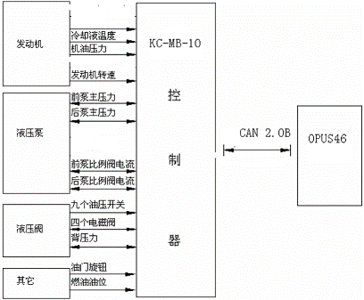 本系統(tǒng)由KC-MB-10控制器、OPUS46顯示、油門控制單元以及一些必要的模擬量、開關量傳感器、模式電磁閥組、開關閥等組成。通過對發(fā)動機和液壓泵系統(tǒng)進行綜合控制,使二者達到最佳匹配,以達到明顯的節(jié)能效果。