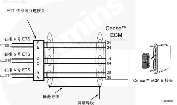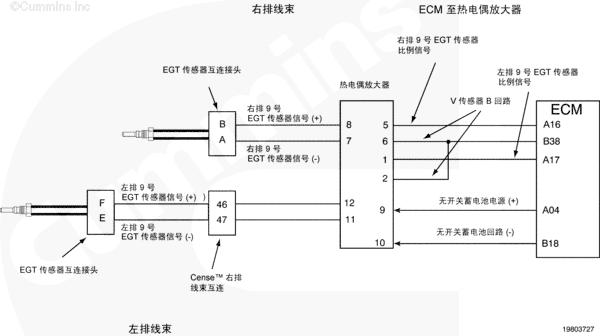 當(dāng)鑰匙處于 ON(接通)或者康明斯發(fā)動(dòng)機(jī)運(yùn)轉(zhuǎn)時(shí),可以使用 Insite™ 來(lái)監(jiān)測(cè)排氣溫度傳感器的溫度值以快速檢查電路圖工作情況。有三個(gè)傳感器連接到右排線束上的一個(gè)接頭。為了進(jìn)行系統(tǒng)快速檢查,從有故障代碼的傳感器上斷開(kāi)傳感器接頭。INSITE™ 讀取到的所有傳感器溫度,除了 9 號(hào)排氣溫度傳感器之外,都應(yīng)為非常低。如果斷開(kāi)了與 7 號(hào)和 8 號(hào)排氣溫度傳感器相關(guān)的接頭,則 9 號(hào)排氣溫度傳感器讀取到的溫度值會(huì)非常高。短接每個(gè)傳感器的傳感器觸針“排氣溫度傳感器信號(hào)(正極)和排氣溫度傳感器信號(hào)(負(fù)極)”。Insite™ 中新的冷連接點(diǎn)處同一接頭上的傳感器的溫度讀數(shù)都將近似相同。這表示線束、熱電偶放大器和 CENSE™ ECM 正常工作,但傳感器有故障。如果接頭、線束、熱電偶放大器或者 CENSE™ ECM 有間歇性、故障或者腐蝕的連接,則有故障代碼的排氣溫度傳感器的溫度值響應(yīng)將不會(huì)如上所述。將需要對(duì)系統(tǒng)的其余部分進(jìn)行故障診斷以確定有故障的部件。該過(guò)程假定同一個(gè)傳感器接頭上的所有三個(gè)傳感器都沒(méi)有故障代碼。