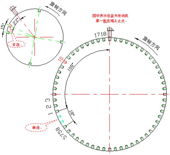 Ø 曲軸傳感器應(yīng)該指示到曲軸信號盤缺齒后的第19個齒(參見圖中齒的編號),或缺齒后108°(曲軸轉(zhuǎn)角)的位置