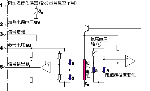 熱膜式空氣流量計(jì)是一個(gè)帶有邏輯輸出的空氣質(zhì)量傳感器,為了獲得空氣流量,傳感器元件上的傳感器膜片被中間安裝的加熱電阻加熱,膜片上的溫度分配被與加熱電阻平行安裝的溫度電阻測(cè)量。通過傳感器的氣流改變了膜片上的溫度分配,從而使得兩個(gè)溫度電阻的電阻值產(chǎn)生差異。電阻值的差異取決于氣流的方向和流量,因此空氣流量傳感器對(duì)空氣的流量和方向具有較高的要求。微機(jī)械制造的傳感器元件的小尺寸和較低的熱容量式的傳感器的響應(yīng)時(shí)間<15ms。如需要可以在傳感器內(nèi)部安裝進(jìn)氣溫度傳感器,用以測(cè)量進(jìn)氣溫度。