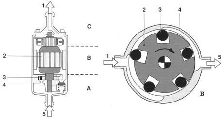 A圖 A 油泵元件 B 電動(dòng)機(jī) C 后蓋 1-壓力端 2-電動(dòng)機(jī)樞軸 3-滾子泵 4-限壓閥 5-進(jìn)油端