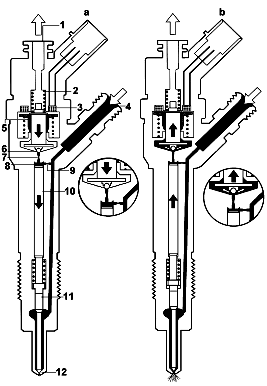 當噴油器的電磁閥被觸發(fā),泄油孔被打開,這引起控制腔的壓力下降,結(jié)果,活塞上的液壓力也隨之下降,一旦液壓力降至低于作用于噴油嘴針閥承壓面上的力,針閥被打開,燃油經(jīng)噴孔噴入燃燒室。這種對噴油嘴針閥的不直接控制采用了一套液壓力放大系統(tǒng),因為快速打開針閥所需的力不能直接由電磁閥產(chǎn)生,所謂的打開針閥所需的控制作用,是通過電磁閥打開泄油孔使得控制腔壓力降低,從而打開針閥。