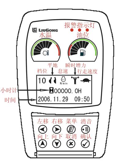 2、 在調(diào)試儀表的菜單中選擇其他測試,選擇開始測試,此時水溫液晶顯示1段,燃油液晶顯示2段,檔位10,出現(xiàn)平地模式、自動怠速、瞬時增力、行走慢的圖標,同時電壓高報警,機油壓力低報警,液壓油溫高報警,報警燈閃爍,蜂鳴器鳴叫,按消音鍵消音。