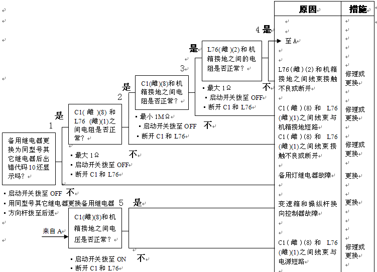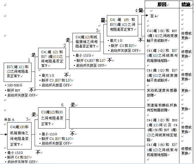 1)方向桿故障 2)組合開關(guān)電源故障 以下線束與電源短路,與機(jī)箱接地短路,觸點(diǎn)有故障或斷開: 3)變速箱和操縱桿控制器C3B(雌)(5)和L04(2)之間線束 4)變速箱和操縱桿控制器C3B(雌)(13)和L04(3)之間線束 5)變速箱和操縱桿控制器C3B(雌)(6)和L04(4)之間線束 6)變速箱和操縱桿控制器故障 |