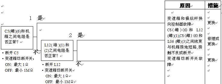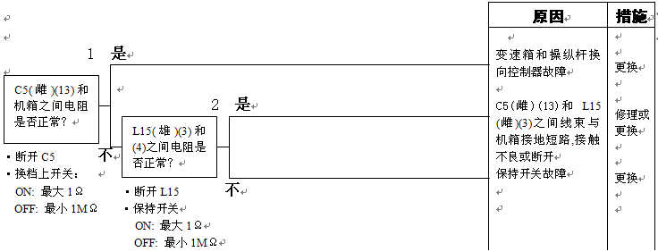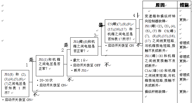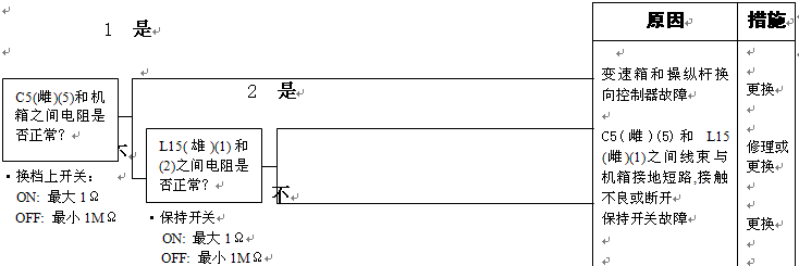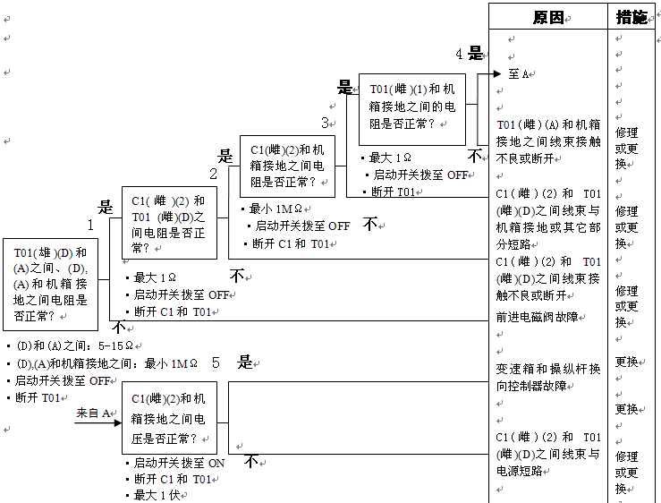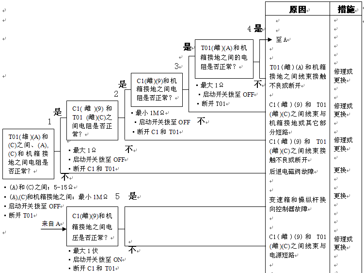 1)變速箱和操縱桿控制器C1(雌)(11)和機(jī)箱接地之間的電阻:5-15Ω 2)變速箱和操縱桿控制器C1(11)和機(jī)箱接地在空擋時(shí)的電壓:小于1伏 |