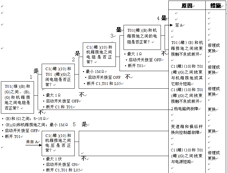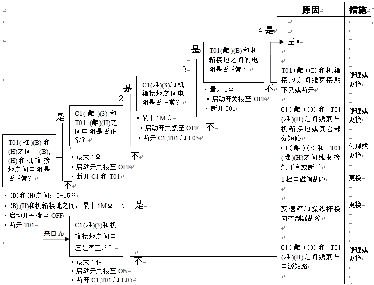 1)1檔電池閥故障 2)變速箱和操縱桿控制器C1(雌)(3)-TL1(1)-T01(H)之間線束與電源短路,與機(jī)箱接地短路,觸點(diǎn)有故障或斷開 3)機(jī)箱-TL1(7)-T01(B)之間線束與機(jī)箱接地短路,觸點(diǎn)有故障或斷開 4)變速箱和操縱桿控制器有故障 | ||||