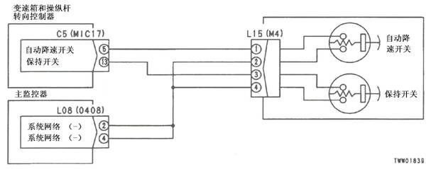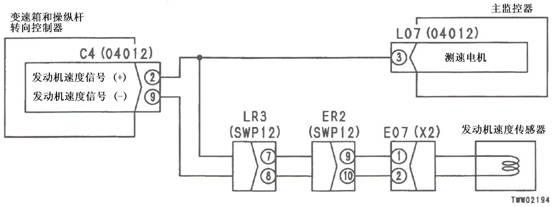 1)發(fā)動(dòng)機(jī)速度傳感器E07(1)和(2)之間的電阻:100-500Ω 2)變速箱和操縱桿控制器C4(雌)(2)和(9)之間的電壓 |
