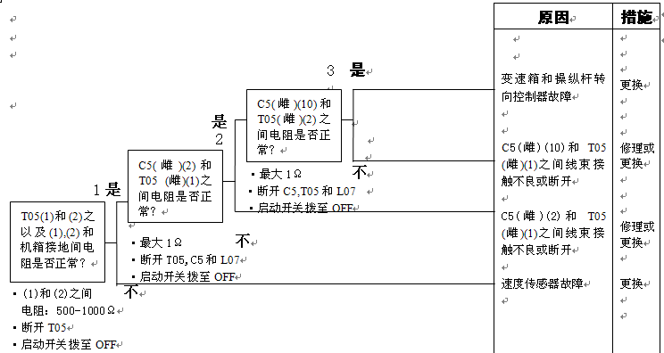 1)速度傳感器故障 2)速度傳感器安裝調(diào)整故障 3)變速箱和操縱桿控制器C5(雌)(2)-TL1(11)-T05(1)間線束觸點(diǎn)有故障或斷開 4)變速箱和操縱桿控制器C5(雌)(10)-TL1(12)-T05(2)之間線束觸點(diǎn)有故障或斷開 5)變速箱和操縱桿控制器有故障 |