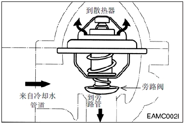 節(jié) 溫 器 保 持 冷 卻 液 的 固 定 溫 度 在(90∼95°C)并通過(guò)防止熱量損失來(lái)提高發(fā)動(dòng)機(jī)熱效率。即當(dāng)冷卻液溫度低時(shí),節(jié)溫器閥門(mén)被關(guān)閉以使得冷卻液經(jīng)旁路直接進(jìn)入水泵。當(dāng)冷卻液溫度升高到打開(kāi)節(jié)溫器閥門(mén)時(shí)的溫度, 旁路被關(guān)閉,通住散熱器的水道被打開(kāi)以便冷卻液受壓流入散熱器。