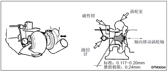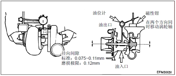 (3) 如果軸向間隙和徑向間隙磨損嚴(yán)重,更換或修理渦輪增壓器。