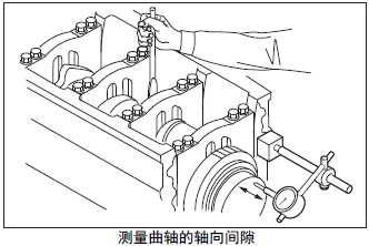 測量推力片的厚度。超過極限值時(shí)更換新的推力片。根據(jù)曲軸的磨損程度,在曲軸重新研磨使用時(shí),使用加大尺寸的推力片。曲軸的研磨要領(lǐng)參考「發(fā)動機(jī)本體的檢測、修理」的「最后端曲軸頸的軸頸寬度研磨」項(xiàng)。