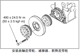 (2) 將曲軸皮帶輪、皮帶、減振器和前側(cè)皮帶輪通過導(dǎo)向螺栓,對準(zhǔn)定位銷位置后安裝。