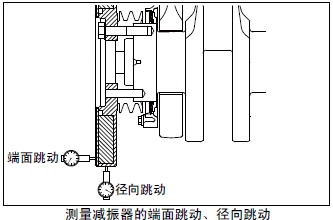 測量減振器的端面跳動和徑向跳動。超過標(biāo)準(zhǔn)值時(shí),檢查螺栓的緊固狀況、安裝配合面有無異物粘附等組裝狀態(tài)。
