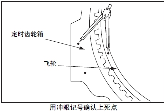 (3) No.1 氣缸的上死點(diǎn)可用這樣的方法確認(rèn),即當(dāng)飛輪端面和定時(shí)齒輪箱上打刻的3個(gè)沖眼記號其距離相等時(shí)為No.1 氣缸的上死點(diǎn)。