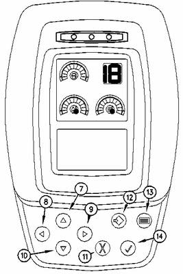 卡特彼勒312C, 315C, 318C, 319C, 320C, 321C, 322C, 325C, 330C 和 M325C 挖掘機(jī)監(jiān)視器面板 (7) "向上"鍵 (8) "向左"鍵 (9) "向右"鍵 (10) "向下"鍵 (11) "取消"鍵 (12) "設(shè)定"鍵 (13) "菜單"鍵 (14) "OK" 鍵 |