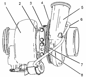 將適當起吊設備連在渦輪增壓器 (1) 上。 渦輪增壓器的重量約為 34 kg (75 lb)。將渦輪增壓器 (1) 安置在排氣歧管上。
