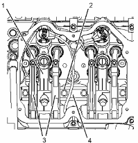 安裝螺栓 (2) ,并擰緊至扭矩為 55 ± 5 N·m (41 ± 4 lb ft)。重新擰緊螺栓 (2) 至扭矩為 55 ± 5 N·m (41 ± 4 lb ft)。 再將螺栓 (2) 轉(zhuǎn)動(dòng) 60 ± 5 度。 按照以下順序擰緊凸輪軸螺栓:2、3、1、4。